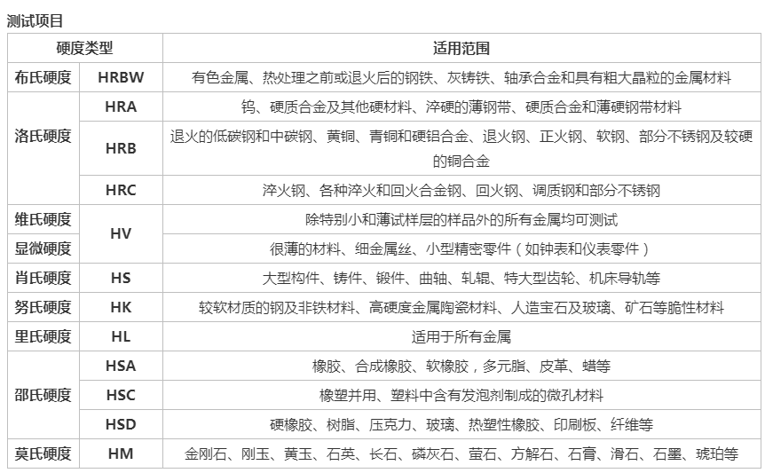 所谓硬度,就是材料抵抗更硬物压入其表面的能力。根据试验方法和适应范围的不同,硬度单位可分为布氏硬度、维氏硬度、洛氏硬度、显微维氏硬度等许多种,不同的单位有不同的测试方法,适用于不同特性的材料或场合。